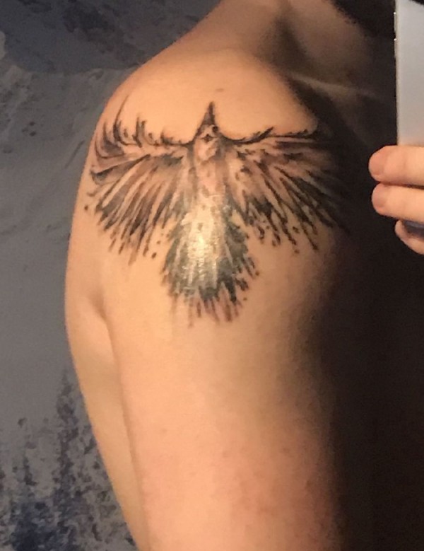 男性左手臂上黑色三只眼乌鸦纹身动物图案纹身
