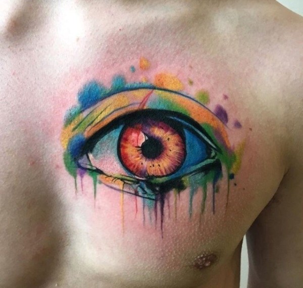 男性左胸部上眼睛纹身水彩泼墨纹身图案