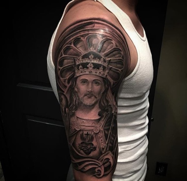 神圣的黑灰色古老传说纹身神话人物花臂纹身图案
