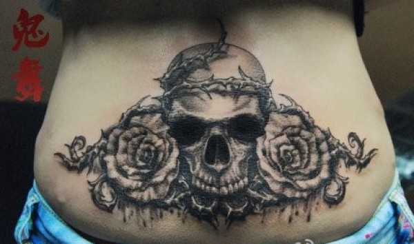 美女腰部潮流很酷的骷髅玫瑰花纹身图案