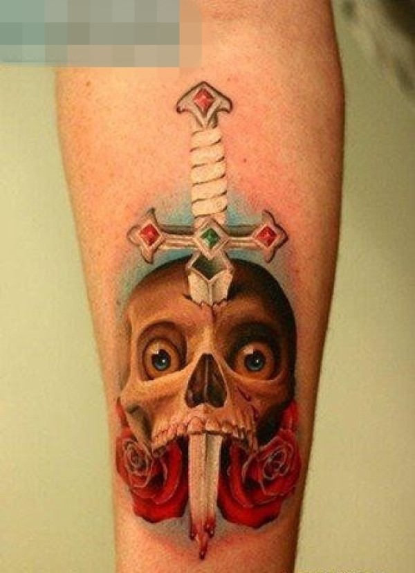 男人手臂霸气经典的匕首与骷髅纹身图案