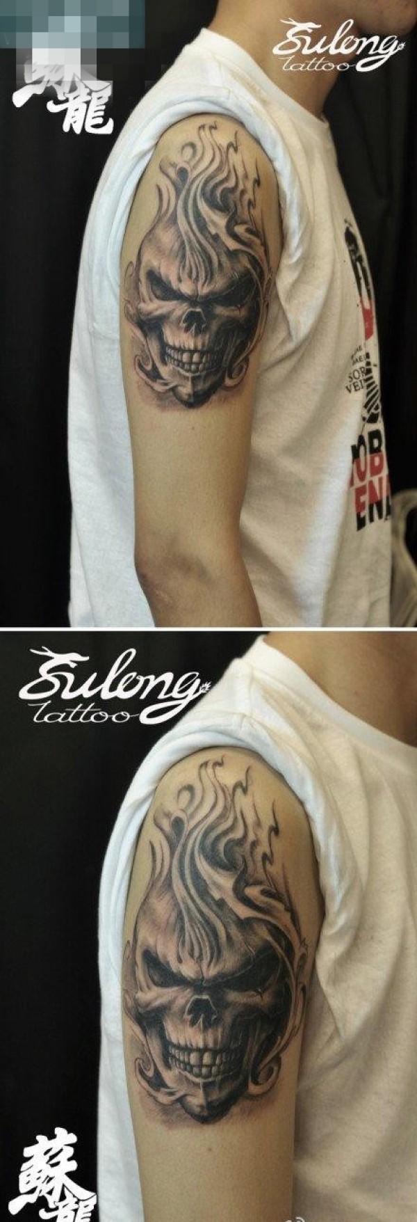 男人大臂黑白彼岸花骷髅_黑白纹身图案大全_纹身图吧