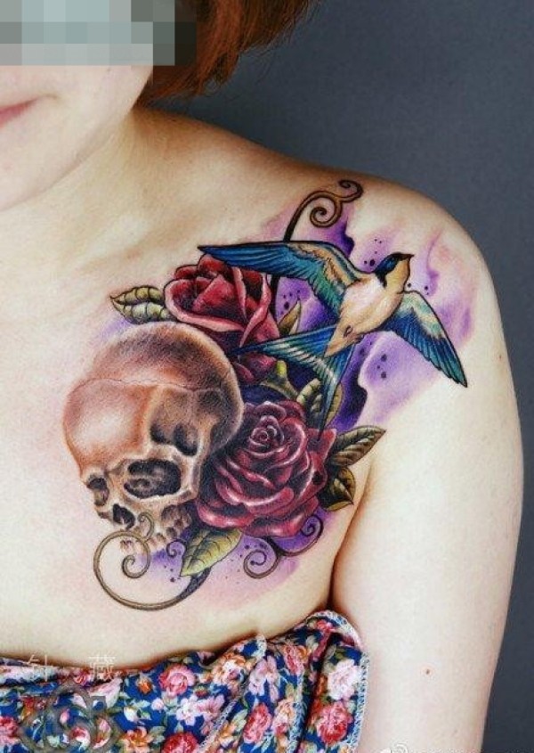 女生前胸时尚经典的骷髅玫瑰花与燕子纹身图案