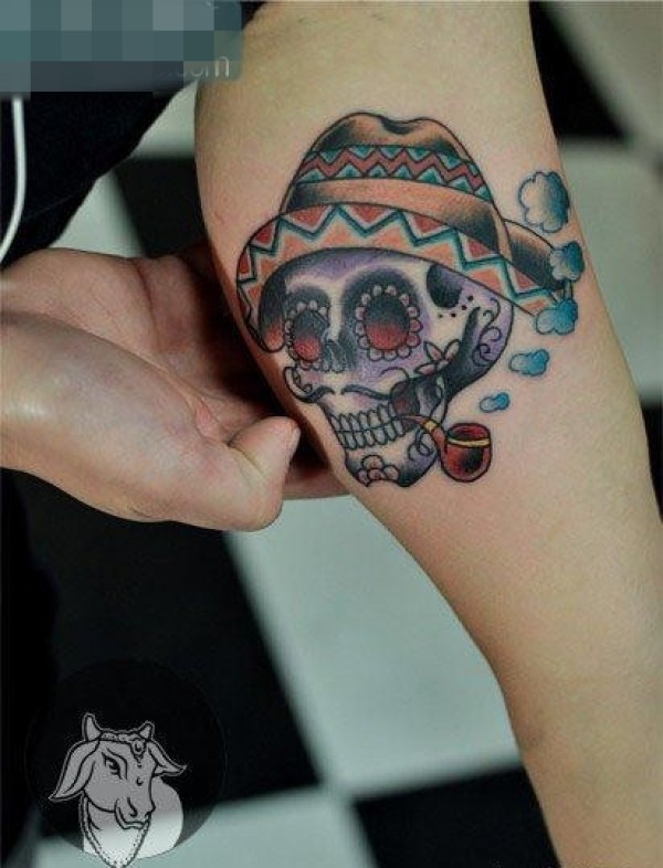 手臂内侧潮流经典的school骷髅纹身图案