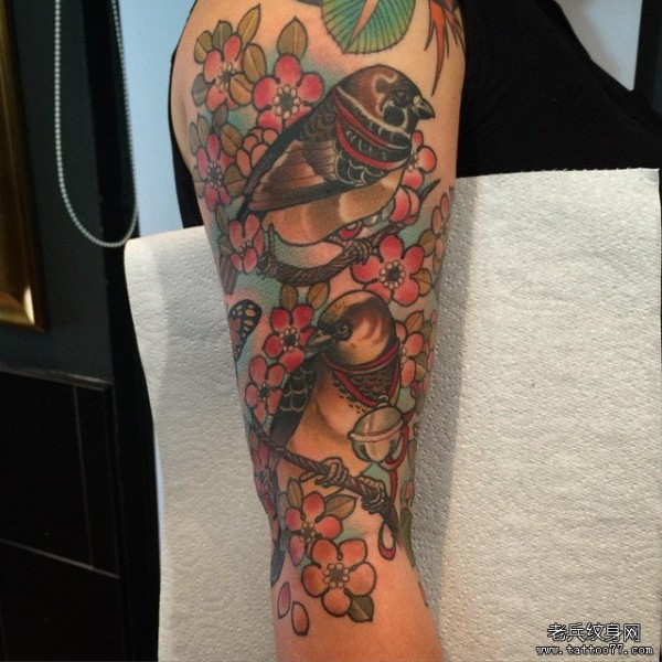 大臂new school鸟花卉彩绘纹身图案