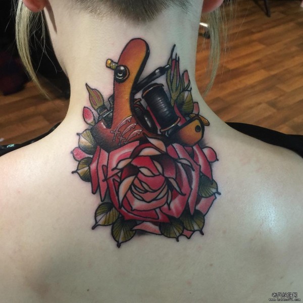颈部school纹身机玫瑰彩绘纹身图案