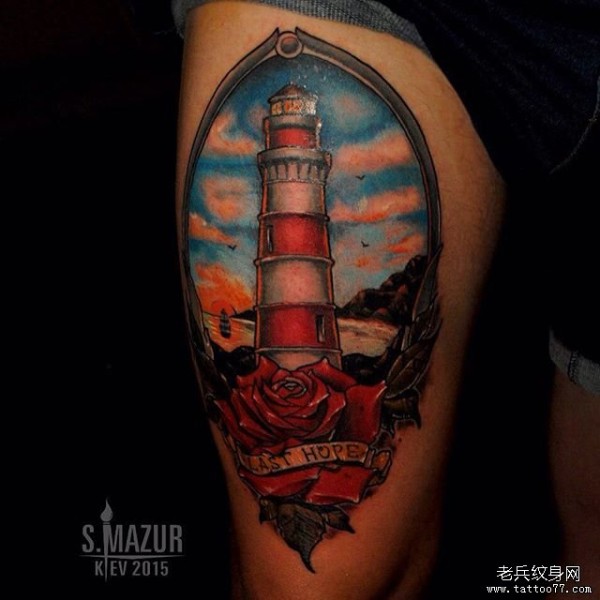 大腿new school灯塔玫瑰彩绘纹身图案