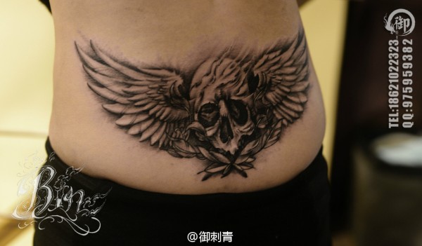 后腰骷髅搭配翅膀,骷髅寓意永恒翅膀寓意自由