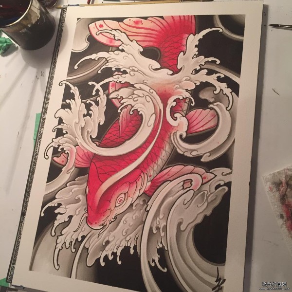 传统鲤鱼浪花彩绘纹身图案手稿