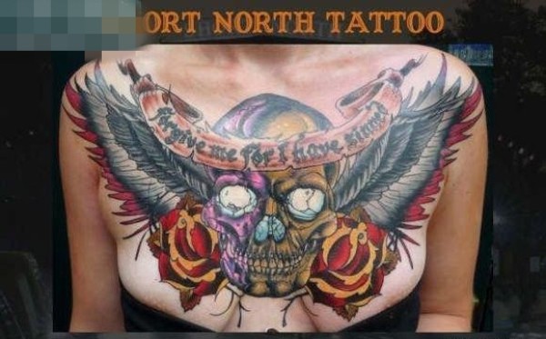 女人前胸霸气超酷的骷髅翅膀纹身图案