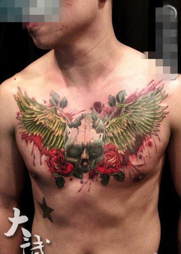 前胸时尚霸气的翅膀与骷髅纹身图案