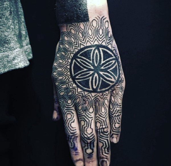 手背上黑色的几何花纹身图片
