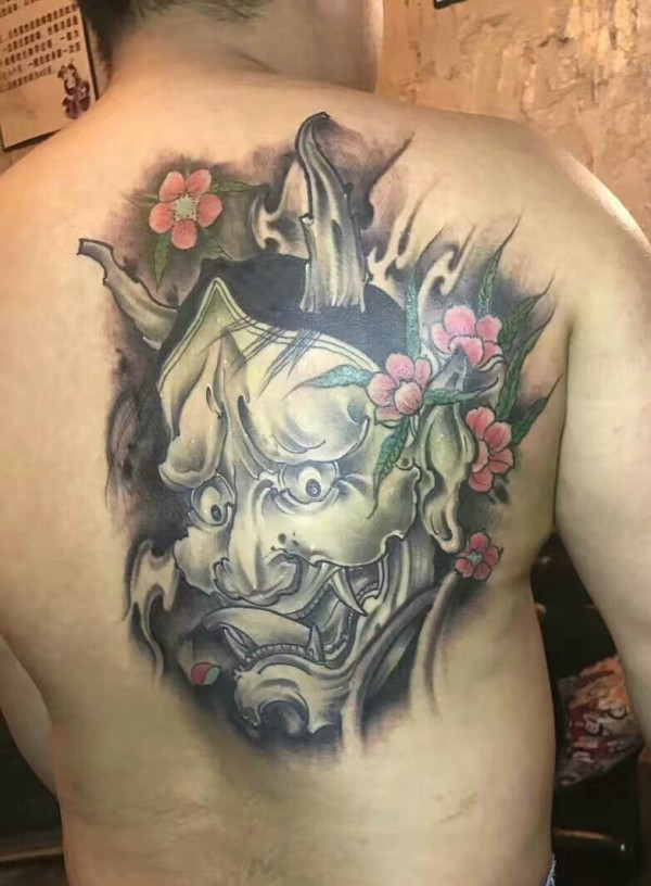 男性遮盖背部传统般若纹身图案