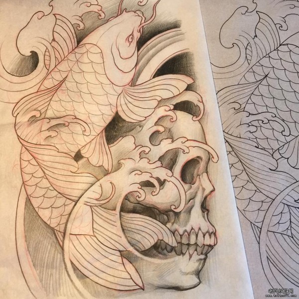 传统鲤鱼骷髅纹身图案手稿