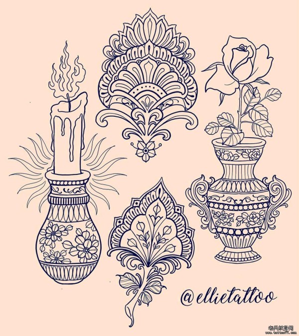 欧美梵花蜡烛花瓶玫瑰纹身图案手稿