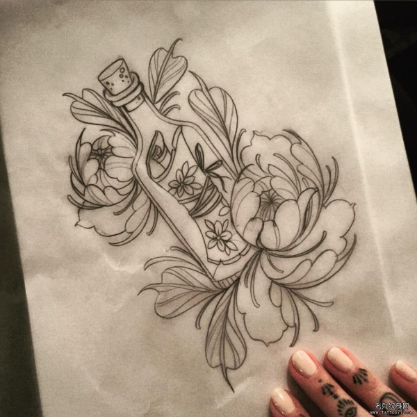 欧美school漂流瓶花卉纹身图案手稿
