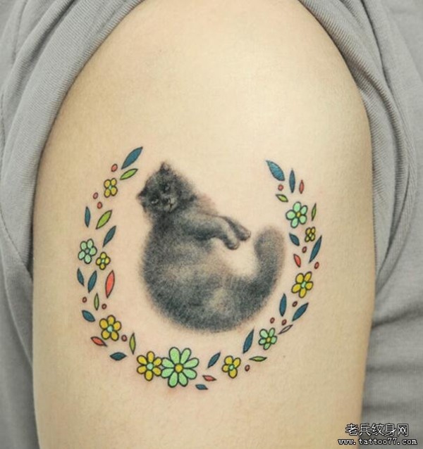 手臂猫花环彩色纹身图案
