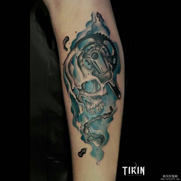 小臂欧美泼墨骷髅机械纹身图案