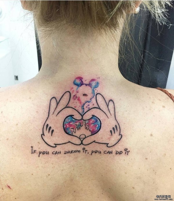 背部卡通手米老鼠泼墨纹身图案
