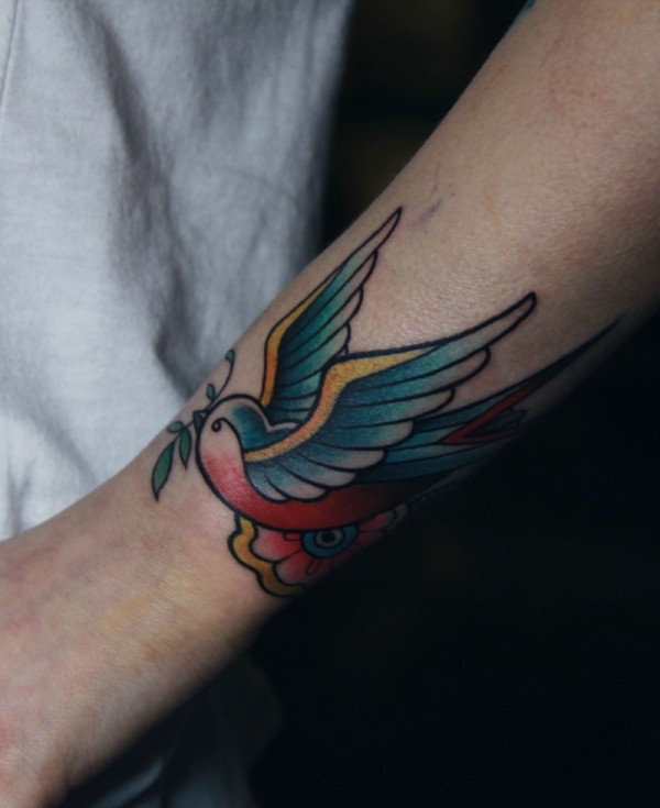 手臂一只翱翔的彩色school小燕子纹身图案