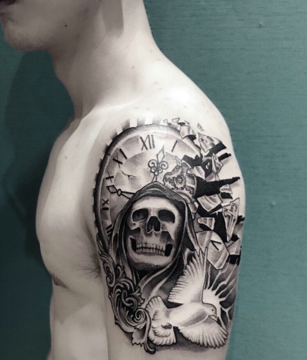 个性男孩手臂骷髅与时钟鸽子纹身图案