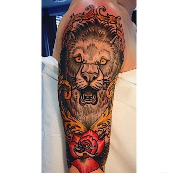 时尚花臂纹身半臂玫瑰花和狮子头纹身图片