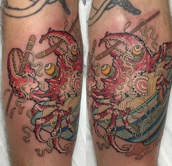 疯狂的彩色拉面和奇怪的海洋小动物食物纹身图案
