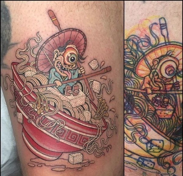 疯狂的彩色拉面和奇怪的海洋小动物食物纹身图案