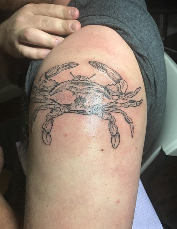 男性左手臂上黑灰色螃蟹纹身动物图片