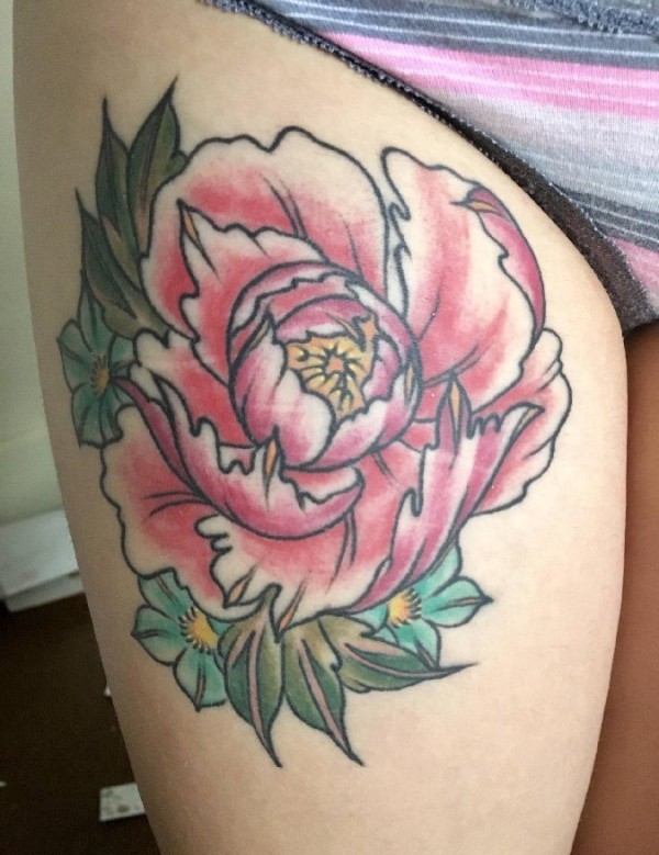 女性右大腿上红色小清新植物纹身牡丹花纹身图片