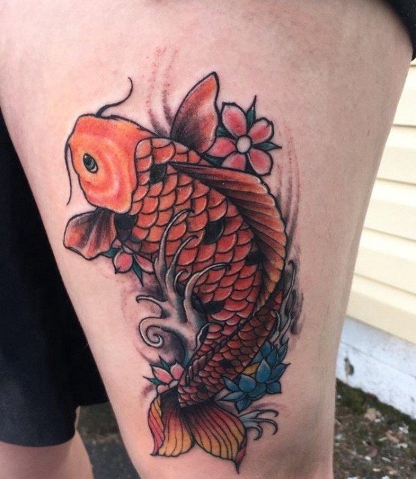 大腿上彩色传统纹身鲤鱼荷花纹身图片