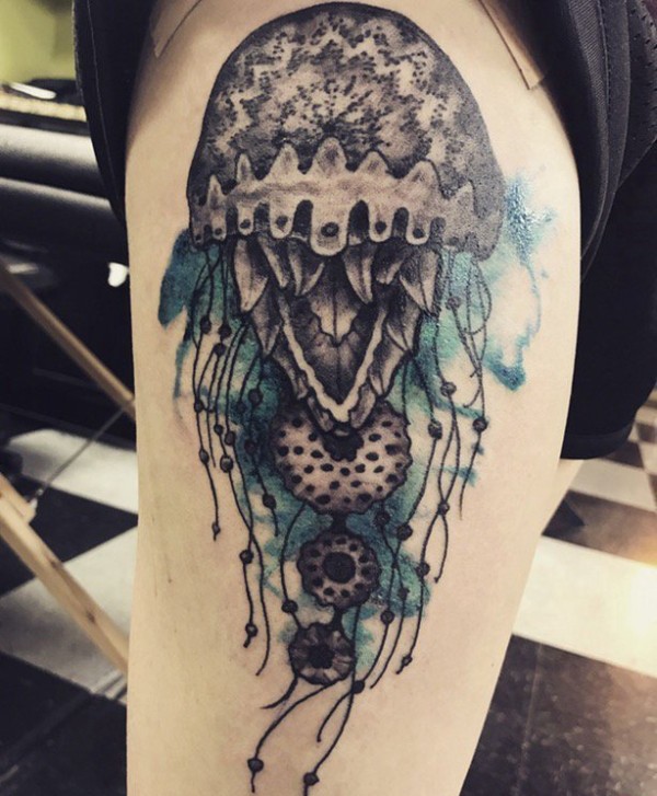 大腿上泼墨风格纹身海洋里的黑色水母纹身图片