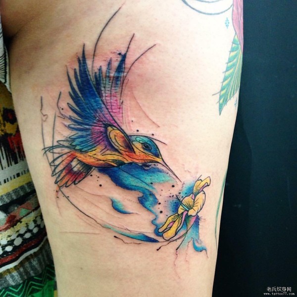 大腿蜂鸟花蕊水彩泼墨纹身图案