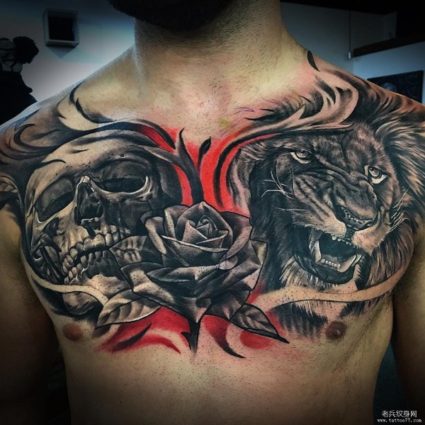 男士欧美胸部狮子骷髅纹身图案