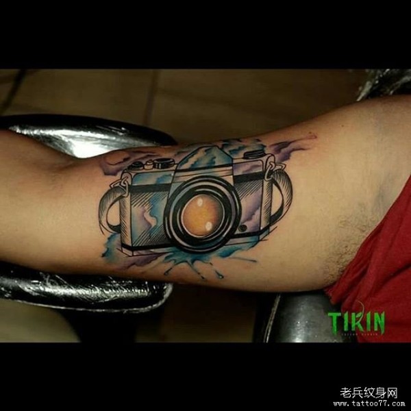 大臂内侧泼墨水彩相机纹身图案