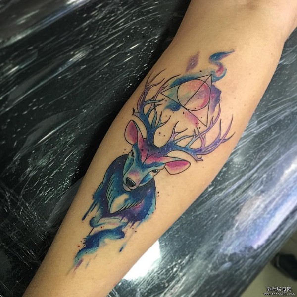 小臂几何麋鹿泼墨纹身图案