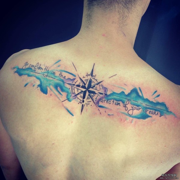 背部指南针泼墨英文字母纹身图案