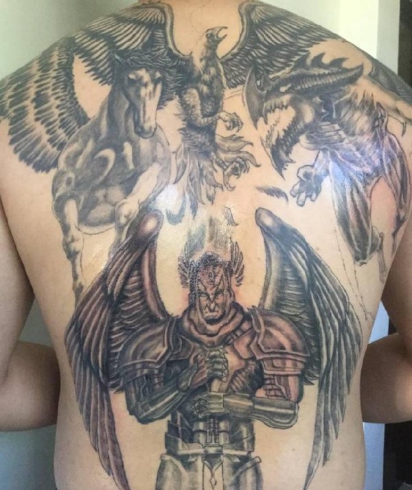 男性满背霸气的卡通带翅膀的人物和动物纹身图片
