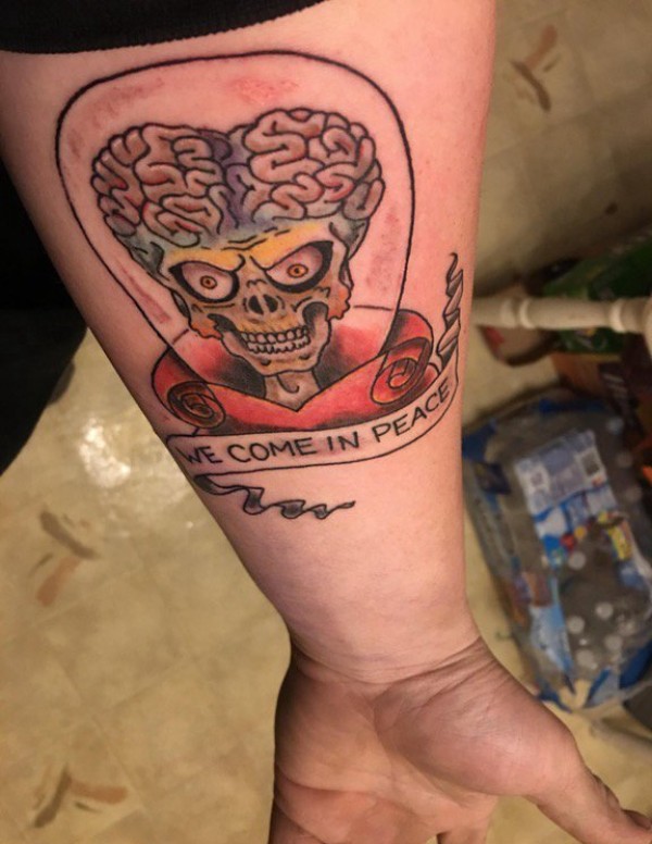 手前臂上可爱的外星人和和平的横幅纹身图片