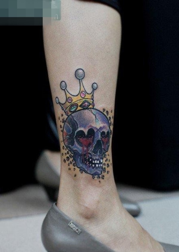 女生腿部好看的彩色骷髅与皇冠纹身图案