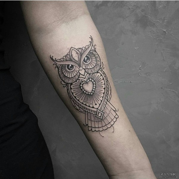 小臂线条猫头鹰心形纹身图案