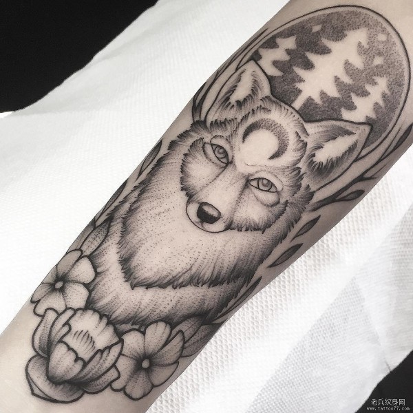 小臂狼头花卉点刺纹身图案