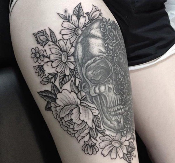黑灰色中国风花卉纹身骷髅头纹身图片