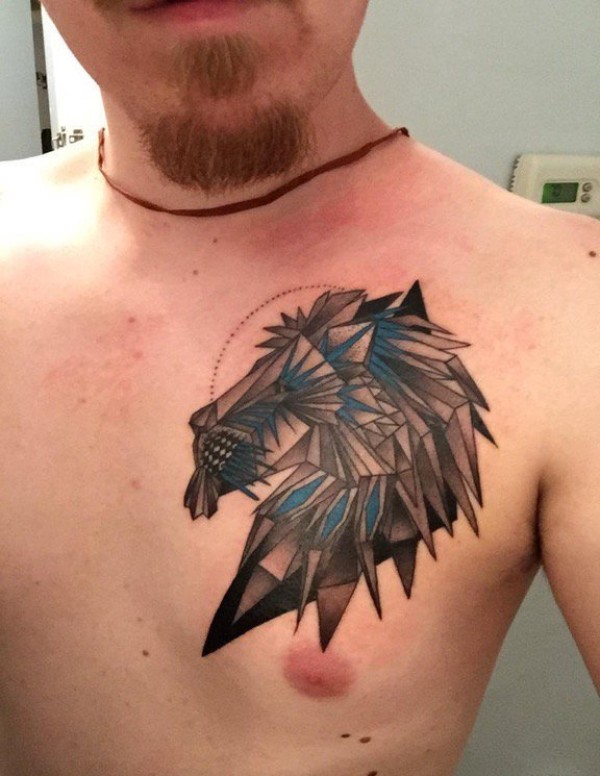 男性胸部黑灰色三角狮子头纹身动物几何纹身图片