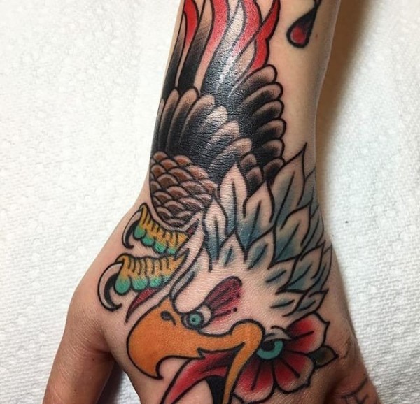手臂上彩色传统纹身动物和骷髅头纹身图案
