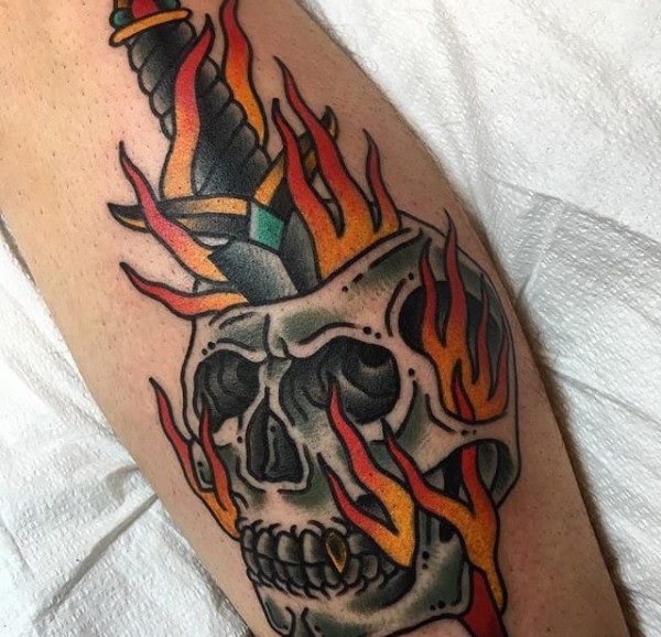 手臂上彩色传统纹身动物和骷髅头纹身图案