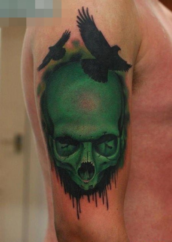 手臂漂亮的彩色骷髅与老鹰纹身图案