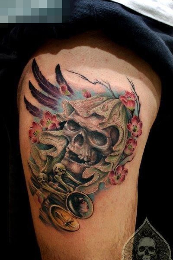 一张腿部超酷的欧美彩色骷髅纹身图案