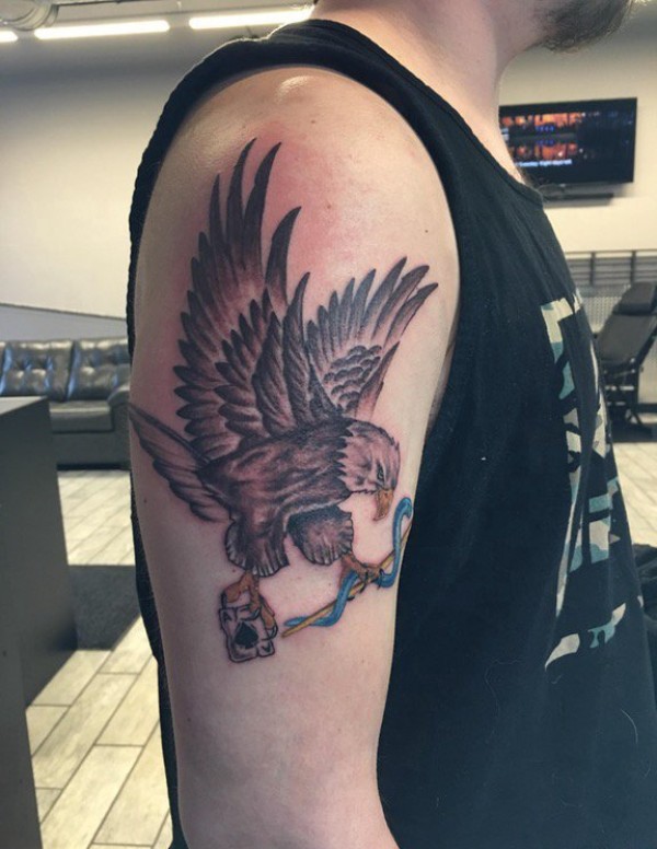 男孩右手大臂膀上的黑灰色老鹰纹身图片