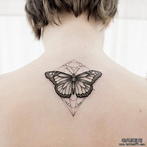 背部蝴蝶几何点刺纹身图案